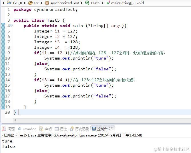 自动装箱和拆箱所带来的问题(1)“==”问题 宝哥大数据 2021-06-22 284 阅读1分钟 "=="比较对象时,比较的是内存地址,但是当比较的是自动装箱中的对象,且其对象的值在-128--127之间时,比较的是对象的内容, 在-128~127之外的则作为对象处理。