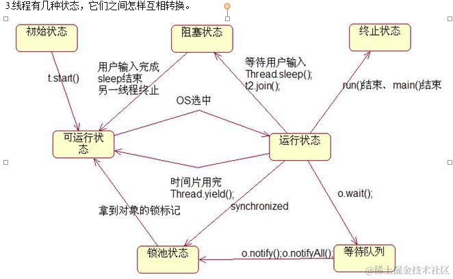 反对使用stop(),是因为它不安全。它会解除由线程获取的所有锁定,而且如果对象处于一种不连贯状态,那么其他线程能在那种状态下检查和修改它们。结果很难检查出真正的问题所在。suspend()方法容易发生死锁。调用suspend()的时候,目标线程会停下来,但却仍然持有在这之前获得的锁定。此时,其他任何线程都不能访问锁定的资源,除非被"挂起"的线程恢复运行。对任何线程来说,如果它们想恢复目标线程,同时又试图使用任何一个锁定的资源,就会造成死锁。所以不应该使用suspend(),而应在自己的Thread类中置入一个标志,指出线程应该活动还是挂起。若标志指出线程应该挂起,便用wait()命其进入等待状态。若标志指出线程应当恢复,则用一个notify()重新启动线程。