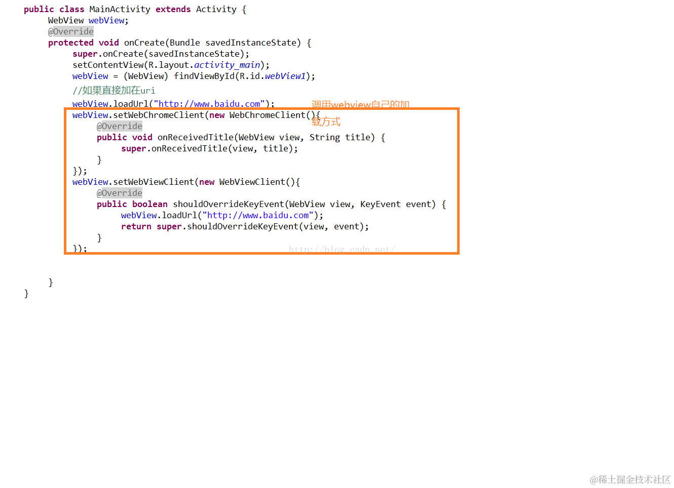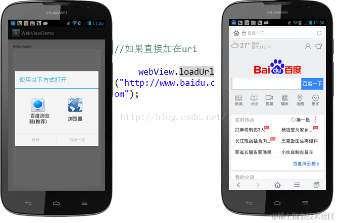加载方式。 可以看到哦uri数据显示在webView中,而不是在浏览器中。