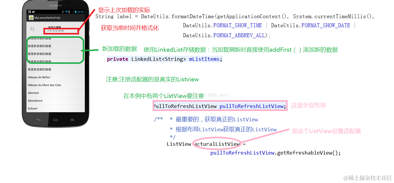 mListItems.addFirst("我是新加载的数据");