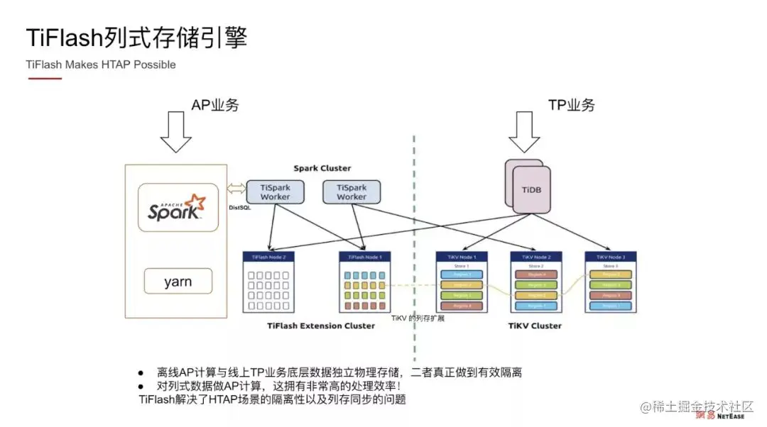 在做 Spark 的计算分析时,我们可以直接从 TiFlash 集群进行读取,计算效率会非常高。用列式数据做 AP 分析,对于行式数据来说,简直就是降维打击。