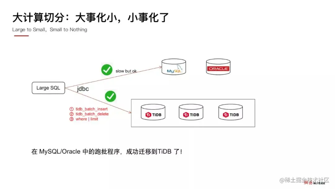 知道这个限制后,我们就可以找到了解决办法,即把大的事务按业务的需求切分为多个小事务分批执行,这样之前跑失败的 SQL 就能成功运行了,而且在 MySQL/Oracle 中的跑批程序,也都成功迁移到了 TiDB。