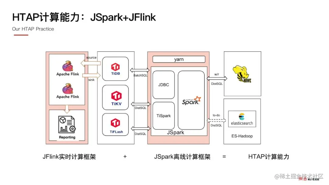JSpark 目前是离线计算的核心框架,除此之外还与 JFlink 实时计算框架相结合,共同组成了大数据处理能力。JSpark 负责离线大数据计算框架,JFlink 负责实时计算框架,两者共同组成了 HTAP 的数据体系。