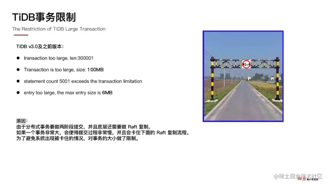 经过一番排查发现,由于分布式事务要做两阶段提交,并且底层还需要做 Raft 复制,如果一个事务非常大,会使得提交过程非常慢,并且会卡住下面的 Raft 复制流程。为了避免系统出现被卡住的情况,TiDB 对事务的大小做了限制,具体限制的内容有单事务的 SQL 语句数、KV 键值对数目和大小、单 KV 键值对大小等。