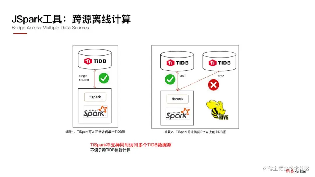 随着业务规模和应用场景的增加,不同数据分布存储在不同的存储引擎。比如日志数据存储在 Hive,数据库数据存储在 TiDB,跨数据源访问需要大量数据迁移,耗时且费力。能否直接打通不同数据源,实现跨源互访?针对这个问题网易游戏采用了 JSpark 工具。JSaprk 是为了打通底层不同存储,实现跨源访问目标而实现的一个离线计算工具。这个工具核心是 TiSpark + Spark 组件,Spark 作为桥梁,可以实现不同数据源的访问。