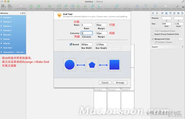 sketch是可以像AI一样,一个文件里有多个画板,并且可以调整多个画板之间的行间距以及行列数。