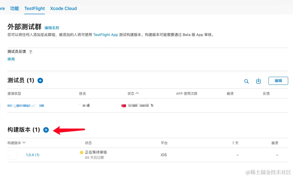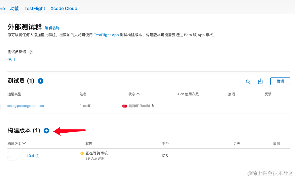 在这里点击加号,把刚才构建成功的版本,放在这里,等待审核就行了,大概需要1-2天时间,剩下的外部测试TestFlight步骤就不赘述了,很多教程,一搜就有.