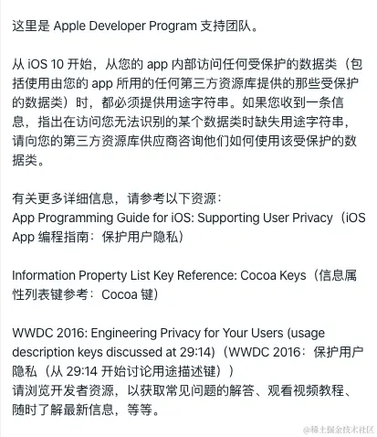 意思就是:第三方库里有的地方用到了某些权限,但是我没有声明用途字符串.还是权限问题.也并没有指出到底缺少哪些权限...所以这个邮件等于回复了个寂寞.😭😭