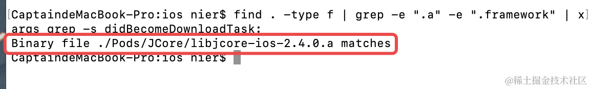 find . -type f | grep -e ".a" -e ".framework" | xargs grep -s didBecomeDownloadTask: