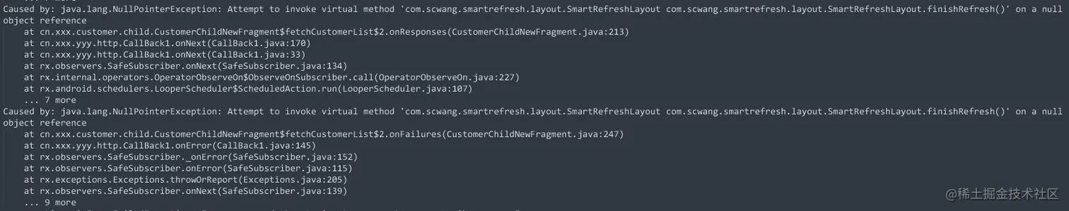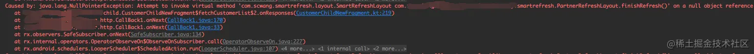 NPE,空指针异常,调用刷新组件的关闭刷新方法报空,排查下日志的其他部分,用 自己的写的脚本 去下混淆,看下是否得到更多有帮助的信息。