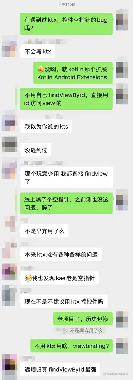 NPE的问题还没解决,但是 干饭要紧,下午睡醒再说,控件为null,隐隐觉得可能是 kotlin-android-extensions (后面都简称KAE) 的锅,因为以前也遇到过根据id获取View实例为空的情况,不过那是因为id重复,于是干饭前在群里问了下小伙伴: