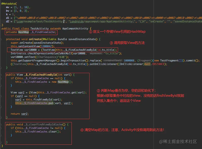 午睡完,继续排查,直接源码看下KAE是怎么让你免去findViewById的,随手写个测试项目,写个TestActivity,里面引用下某个控件,依次点击 Tools → Show Kotlin ByteCode → Decompile: