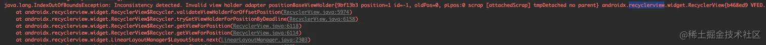 模拟APP被回收就简单了,AS跑下程序,来到出问题的页面,APP退到后台,直接在Logcat把程序干掉,接着重新打开程序,静待片刻,果然,崩溃了,看下日志信息: