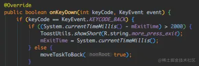 脑子里突然蹦出一个想法,该不会是因为APP被回收,重新打开Activity重建的问题把,因为APP中有一个跟很多APP一样的鸡贼操作,虽然提示了 "再按一次退出程序",但其实是调用moveTaskToBack()退到后台而已。
