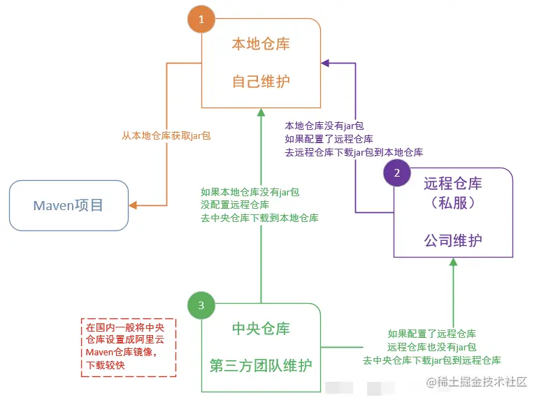 - 首先在本地资源库中查找依赖,若不存在,则进入下一步,否则,退出;