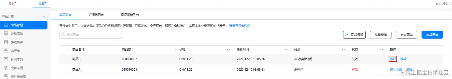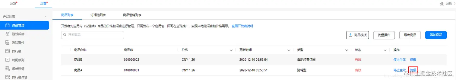 3. 在商品列表中,选择“消耗型”、“非消耗型”或“自动续费订”商品所在行的“编辑”。