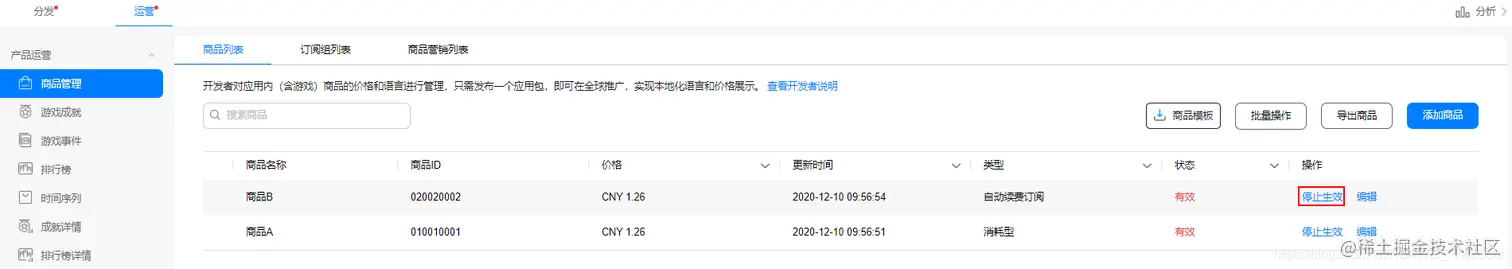 选择“运营”页签左侧导航栏选择“产品运营 > 商品管理”。在商品列表中,点击需失效商品所在行的“停止生效”,确认后即失效。