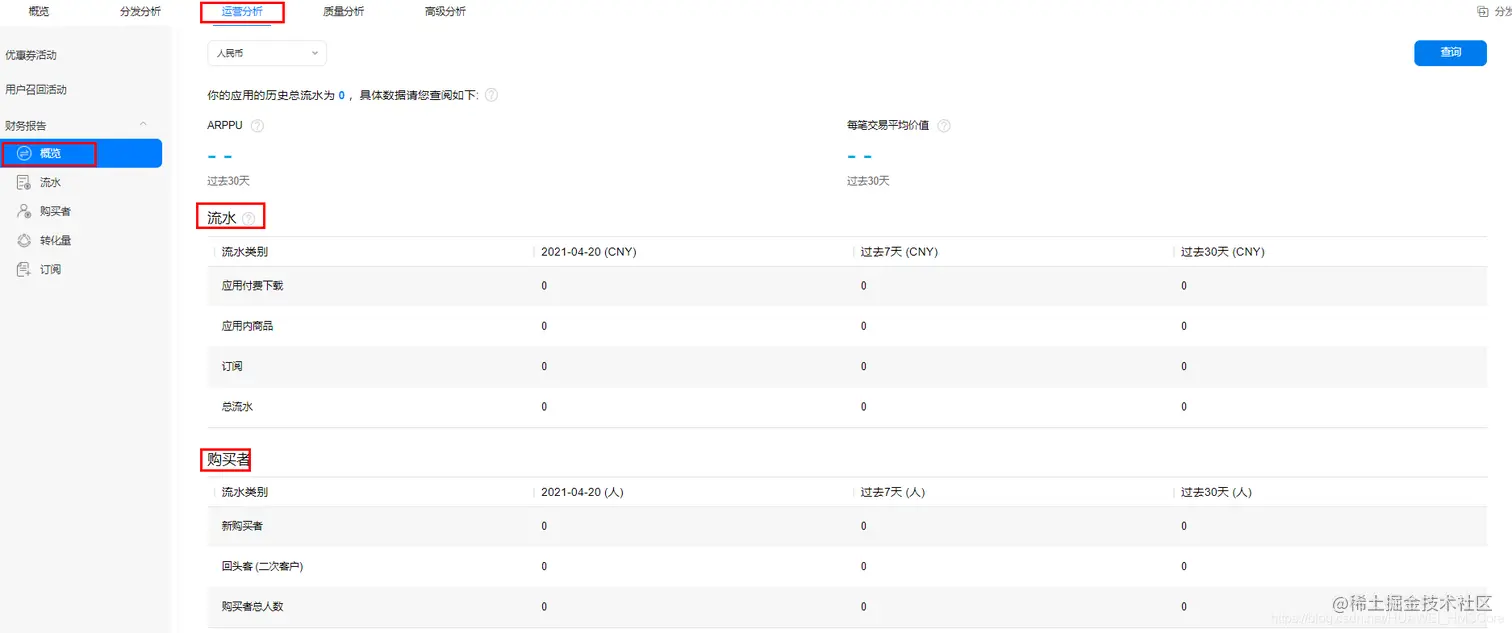 1.2选择进入“运营分析”选择左侧边栏“概览”,即可查看应用内商品售卖数据