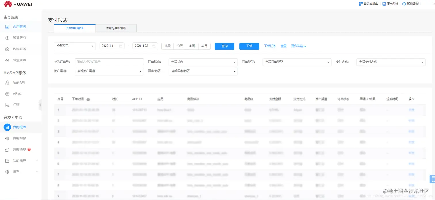 除了通过上述步骤获取流水及购买者数据外,在华为开发者联盟官网,可查看支付报表。