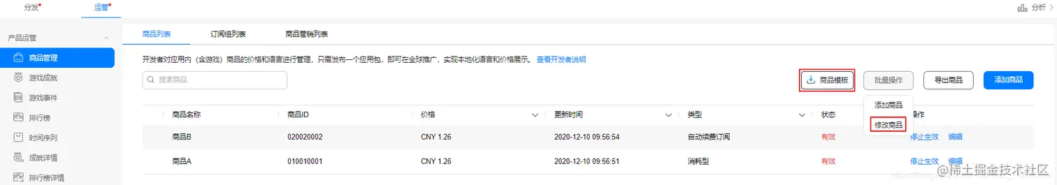 应用内商品支持基于原商品的信息修改操作。当你需要结合热门话题调整商品描述来吸引用户关注,当活动促销季根据活动主题修改商品名称,以及调整商品价格……都可在原商品基础上进行编辑修改。IAP提供的商品修改功能非常灵活,可根据具体商品修改需要选择单个或批量商品修改。