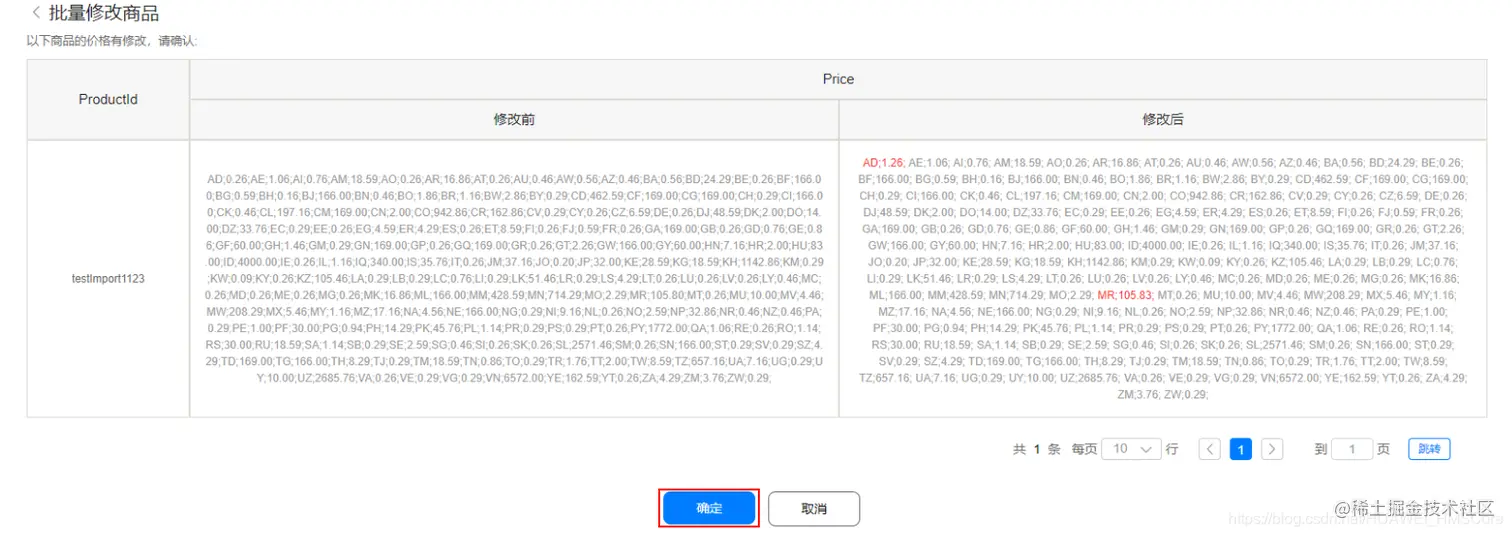 3. 在确认界面可查看商品信息修改前后对比图,点击“确定”。