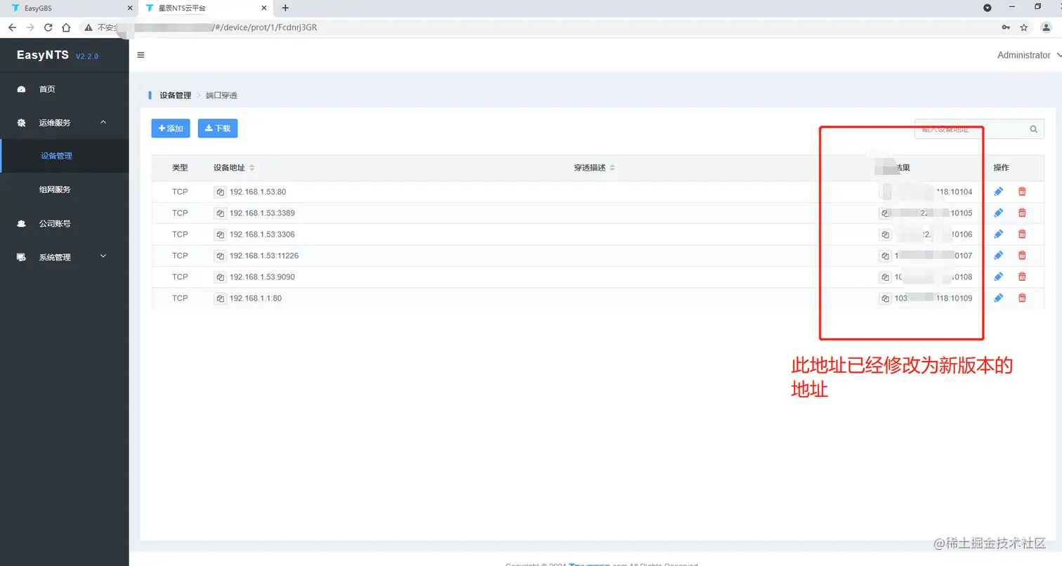 EasyNTS的主要作用就是解决异地视频共享/组网的需求,网页对域名进行添加映射时,添加成功后会生成一个外网访问地址,在浏览器中输入外网访问地址,即可查看内网应用。在必要时,EasyNTS进行穿透接口的数据迁移,本文分享下EasyNTS穿透接口数据迁移的方法。