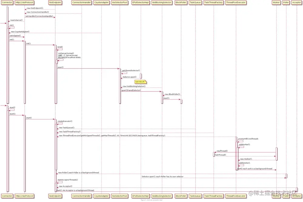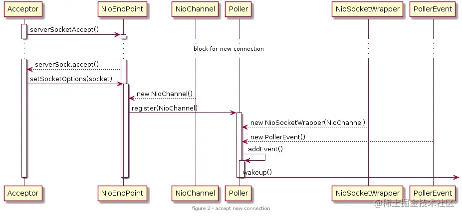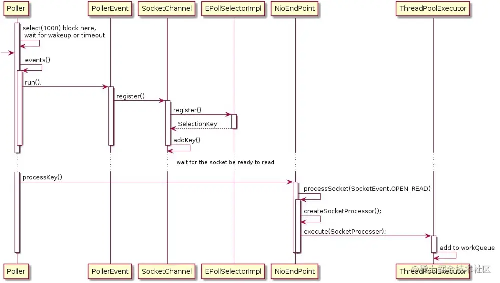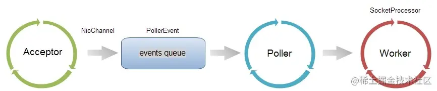 - addEvent() 方法会将 Socket 添加到该 Poller 的 PollerEvent 队列中。到此 Acceptor 的任务就完成了。