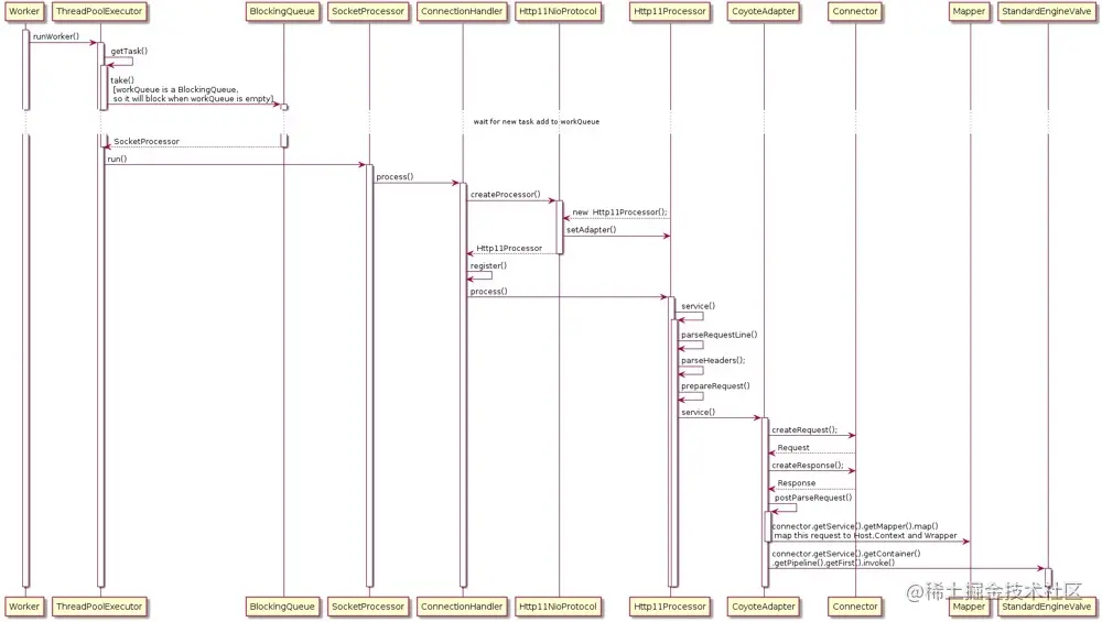 - 当新任务添加到 workQueue后,workQueue.take() 方法会返回一个 Runnable,通常是 SocketProcessor,然后 worker 线程调用 SocketProcessor 的 run() 方法对 Socket 进行处理。