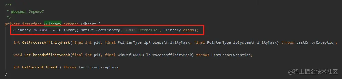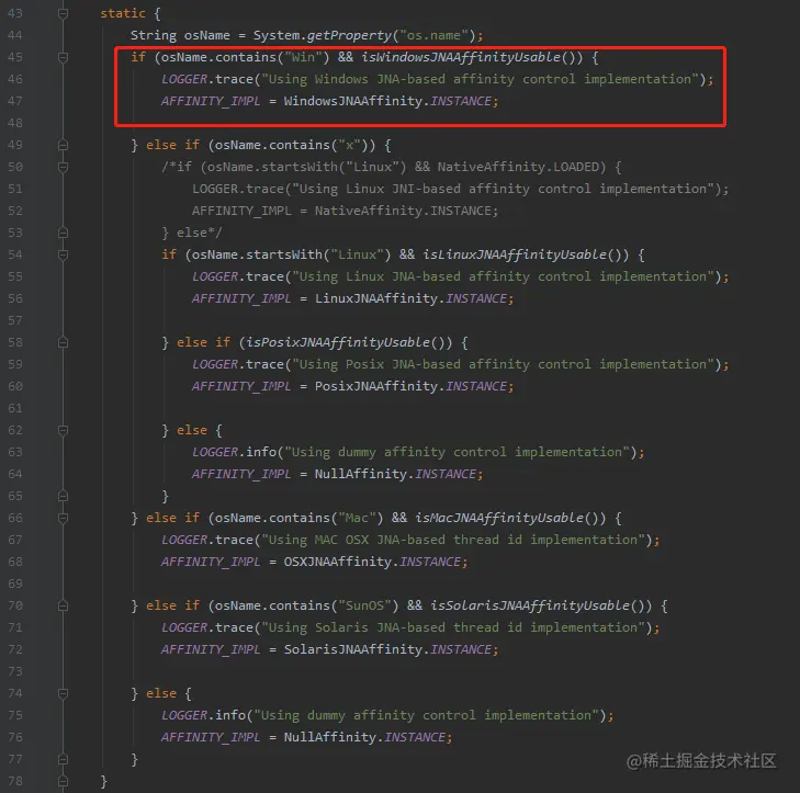 比如,在实现类 WindowsJNAAffinity 里面,你可以看到在它的静态代码块里面调用了这样的逻辑: