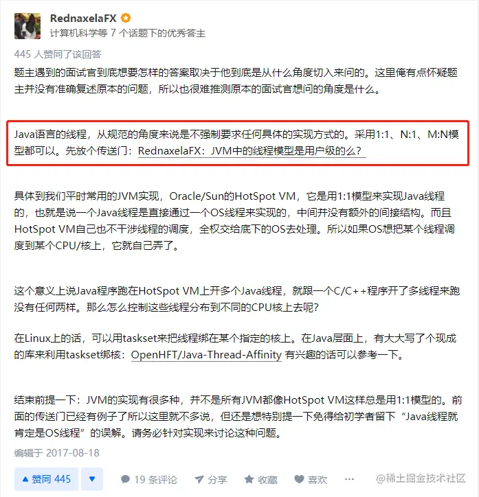 因为我们用的最多的 HotSpot 虚拟机,就是采用 1:1 模型来实现 Java 线程的。