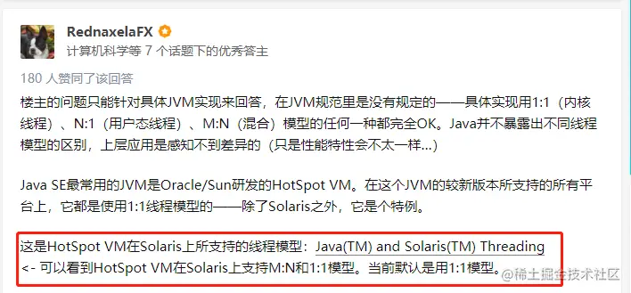 因为我们知道,在 Solaris 平台上的 HotSpot 虚拟机,同时支持 1:1 和 N:M 的线程模型。
