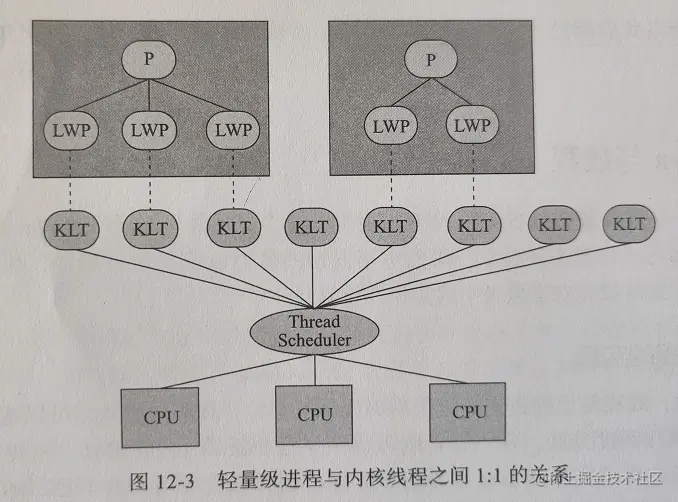 然后你看上面的图片,KLT 线程上面都有一个 LWP 与之对应。