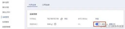 - **(推荐)SSL 方式:**实例连接管理页面的 SSL 开关开启,并且上传证书到 ECS。