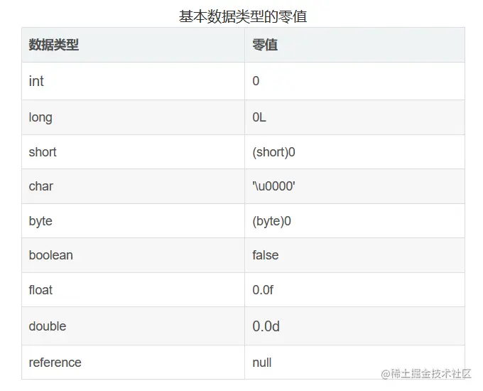 这里所设置的初始值通常情况下是数据类型默认的零值(如0、0L、null、false等),而不是被在Java代码中被显式地赋予的值(下表:基本数据类型的零值 )。