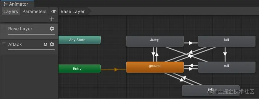像这里,Base Layer已经够乱了,但我还完全没有做人物攻击的FSM诶,那就再给他加一层,在新的一层里负责攻击动画的切换好了。