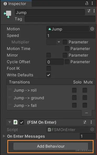 这三个接口很直观,以至于很容易想到刚刚说的起跳要怎么实现:重写“jump”状态中的OnStateEnter接口,获得角色的rigidbody,给它增加一个向上的速度嘛。