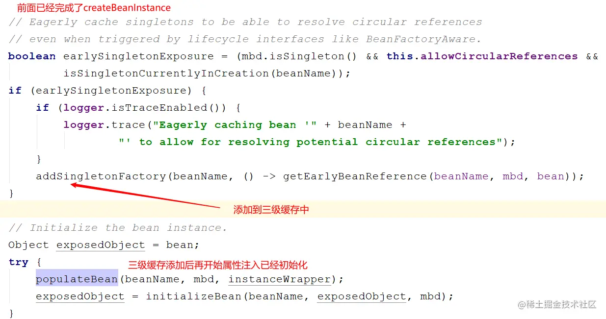 在完成Bean的实例化后,属性注入之前Spring将Bean包装成一个工厂添加进了三级缓存中,对应源码如下: