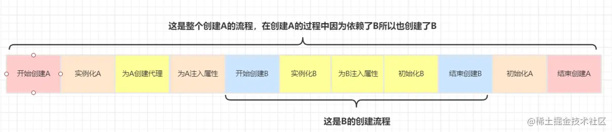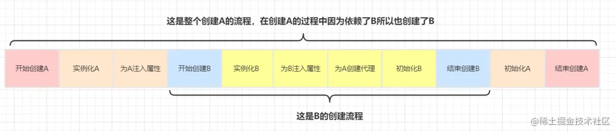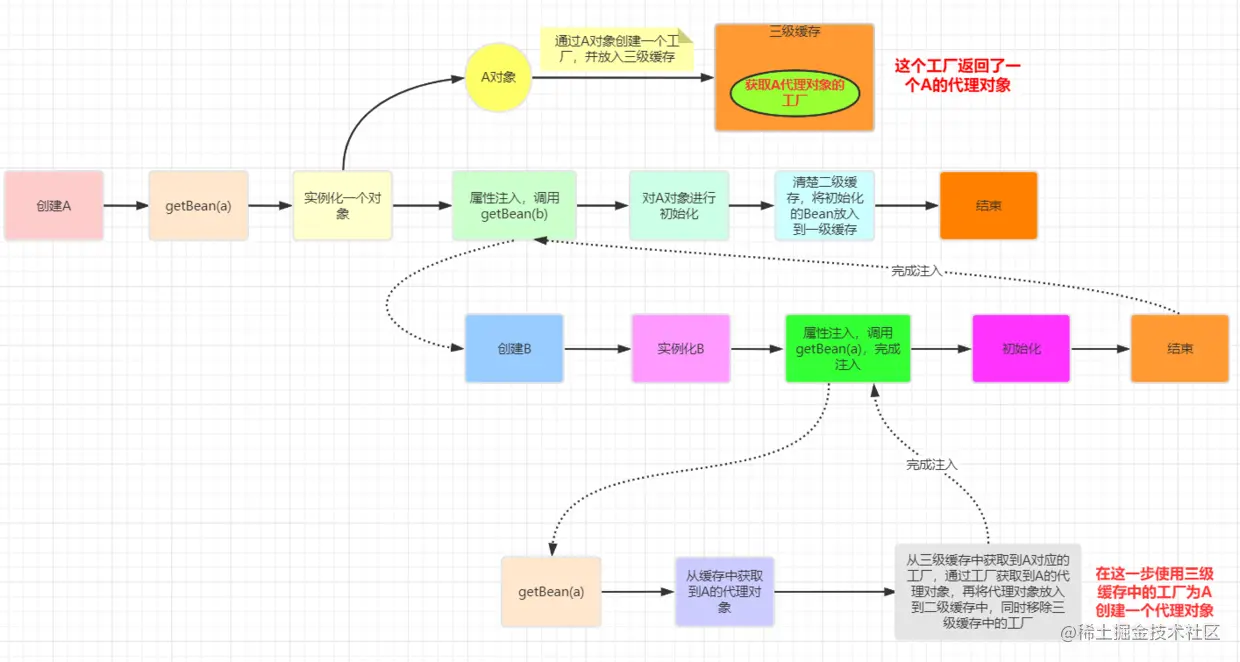 从上图中我们可以看到,虽然在创建B时会提前给B注入了一个还未初始化的A对象,但是在创建A的流程中一直使用的是注入到B中的A对象的引用,之后会根据这个引用对A进行初始化,所以这是没有问题的。