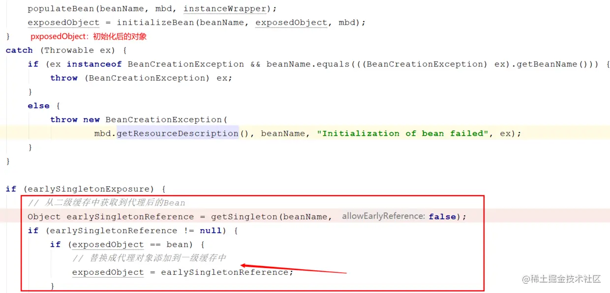 我们思考一种简单的情况,就以单独创建A为例,假设AB之间现在没有依赖关系,但是A被代理了,这个时候当A完成实例化后还是会进入下面这段代码: