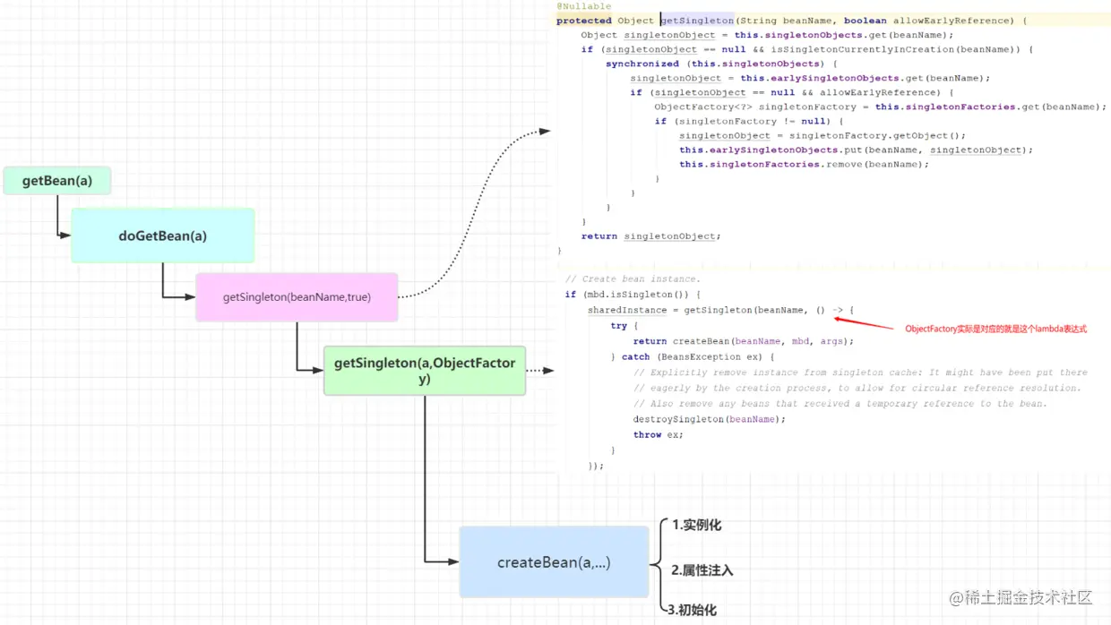 因为B需要注入A,所以在创建B的时候,又会去调用getBean(a),这个时候就又回到之前的流程了,但是不同的是,之前的getBean是为了创建Bean,而此时再调用getBean不是为了创建了,而是要从缓存中获取,因为之前A在实例化后已经将其放入了三级缓存singletonFactories中,所以此时getBean(a)的流程就是这样子了