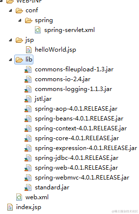 1。准备jar包。spring mvc 已经到了版本4,网上的很多资料已经不在适用。给出的下载地址也无法适用。这是非常痛苦的。我费了好大功夫才获得这些JAR包。