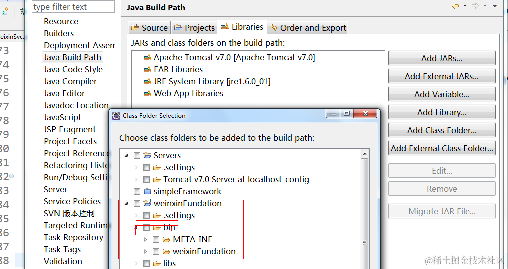 2.进入 libraries选项卡,点击 add class folder按钮,引入刚刚的子project下的bin文件夹