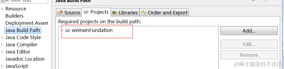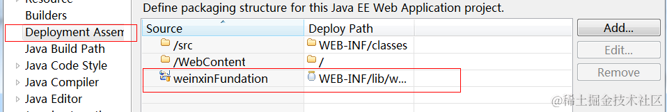 4.指定导出 该工程的jar包。这一步非常重要,我折腾N久的。点击左侧的 竖标签卡 选择 Deployment assembly, 点击 add按钮,进入project (这里会列出所有引用过的project)下,选中它。
