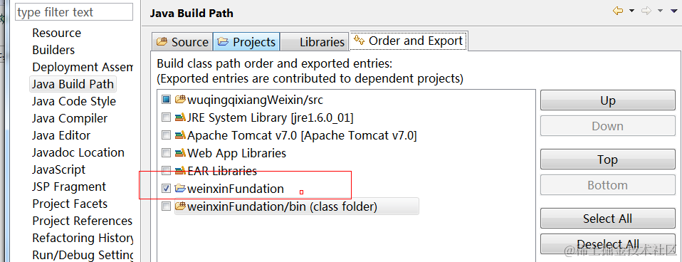 3.进入 order and export 选项卡,勾选 刚刚的那个 子project 的工程,如下图所示: