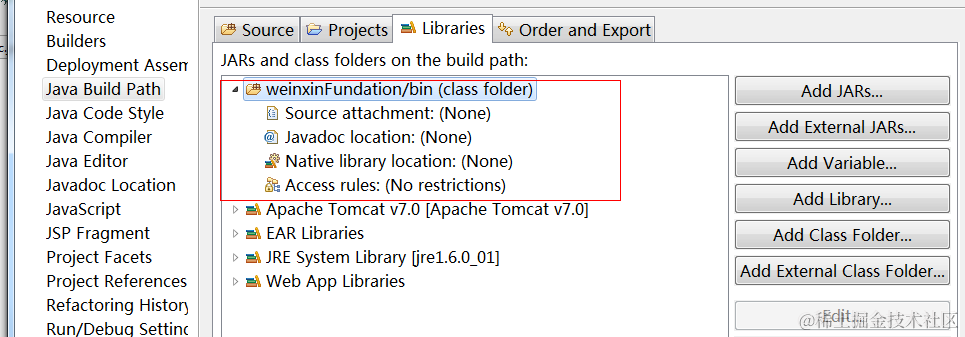 1.打开工程,在eclpise中的 主project上,鼠标右键选择 property,进入java build path选项卡