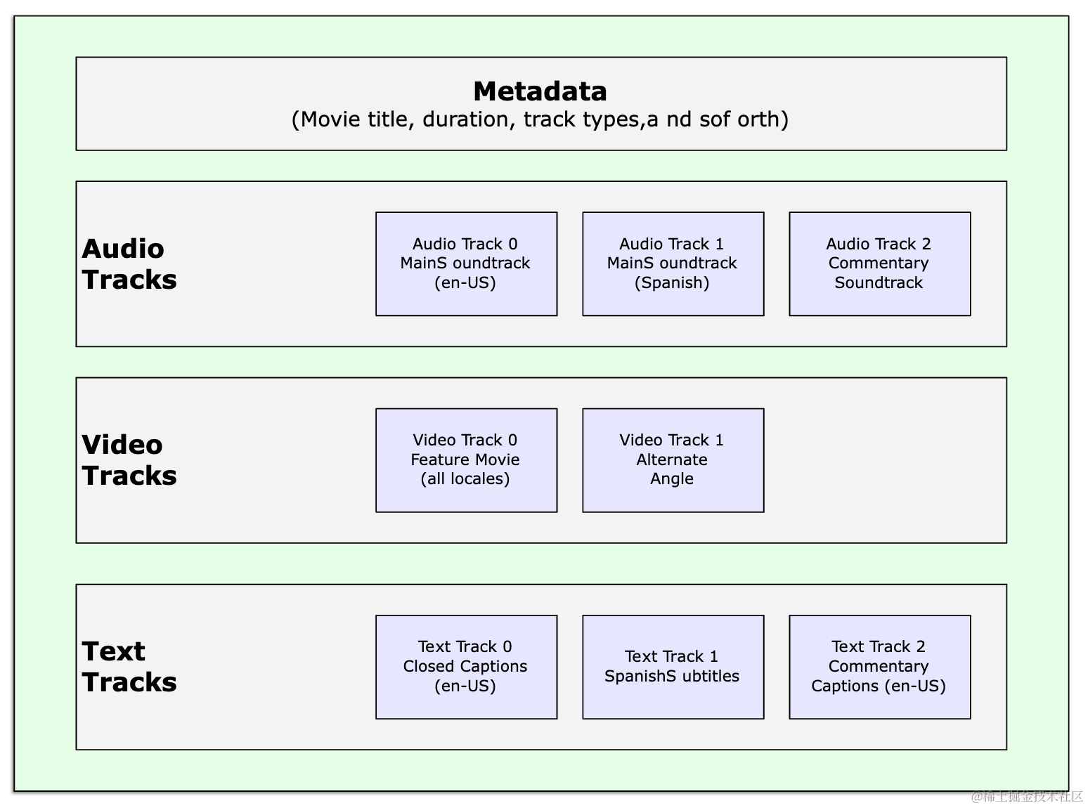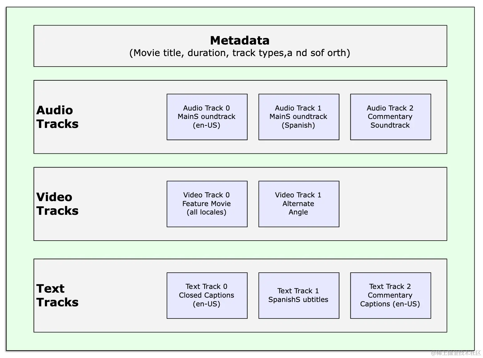 像 MP3、MP4、WebM 这些 视频格式,定义了构成媒体文件的音频轨道和视频轨道的储存结构,其中还包含描述这个媒体文件的元数据,以及用于编码的编码译码器等等。