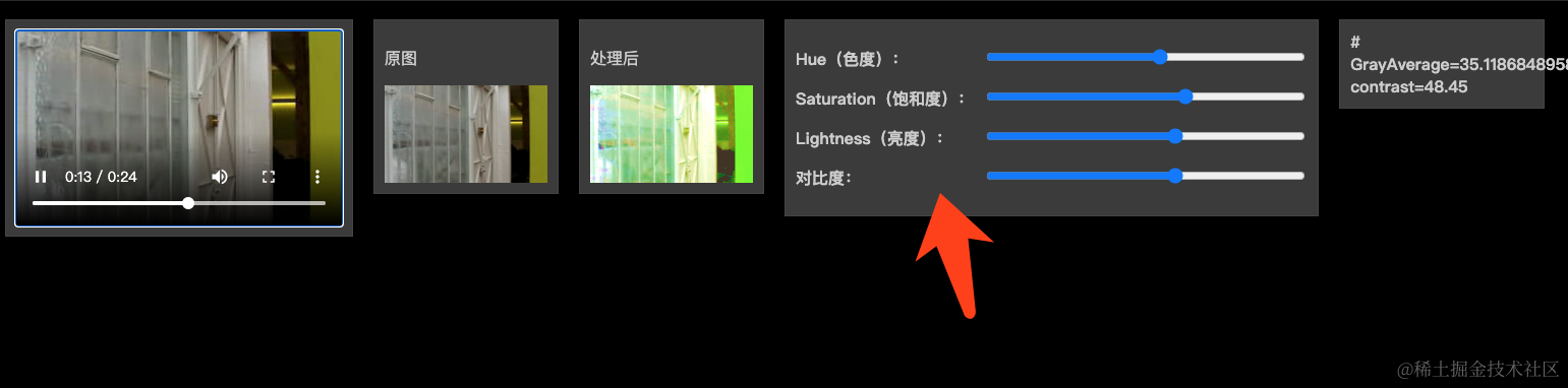 即 获得图新的像素后 的RGB 色后,通过一个 js 库 ColorConverter 转成 HSL 格式。然后就可以通过 滑动块变更 HSL 中的参数值了。