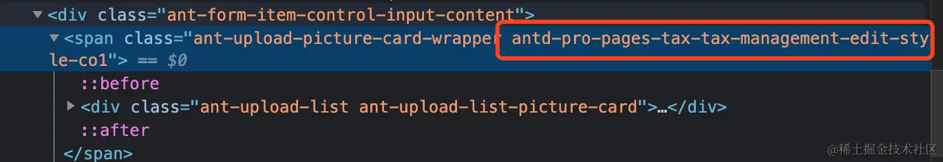 问题来了,跟踪css样式发现 antd 中的 Upload 组件用了 .ant-upload.ant-upload-select-picture-card 这个样式。想修改这个样式怎么做呢?