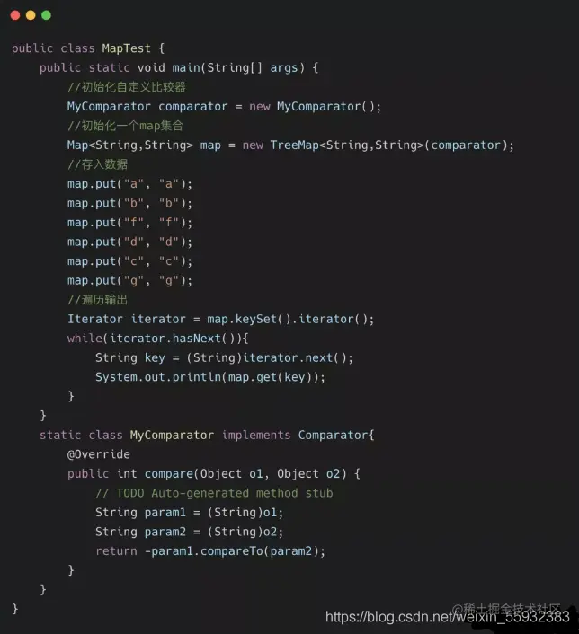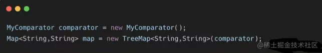 之后,通过MyComparator类初始化一个比较器实例,将其作为参数传进TreeMap的构造方法中: