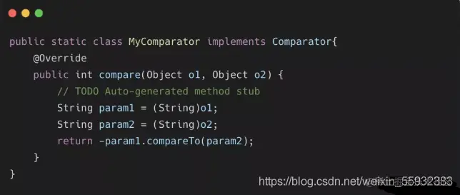 通过自定义的比较器来实现。定义一个比较器类,实现Comparator接口,重写compare方法,有两个参数,这两个参数通过调用compareTo进行比较,而compareTo默认规则是: